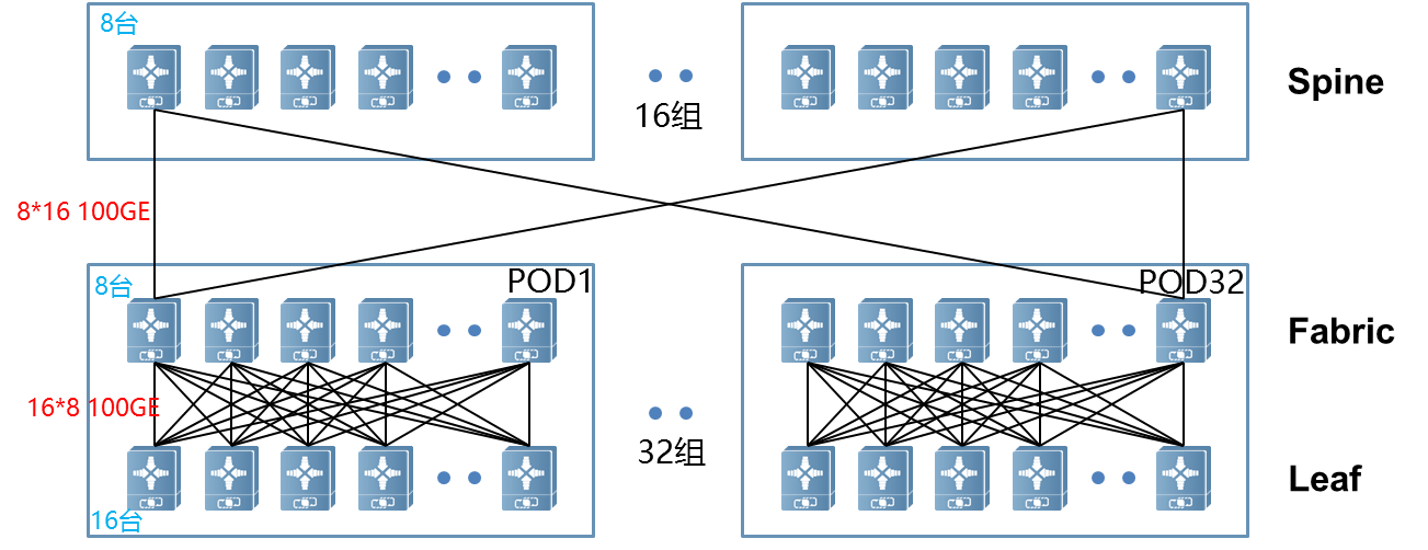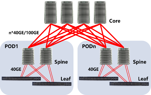 从上述架构设计说明中,不难看出数据中心集群规模和收敛比,主要受限于机框式核心设备的端口密度,而业界核心设备的更新换代都是以数年为单位进行的,大大阻碍了数据中心规模和发展。另外,动辄数百个40GE接口或者100GE接口的核心设备单台运行功率已达20KW,而国内大部分IDC机房的平均功率只有5KW~6.5KW/机柜,这给机房供电系统的维护管理带来了巨大的挑战。如何摆脱核心设备端口密度的限制?如何摆脱核心设备对IDC机房供电系统的挑战?