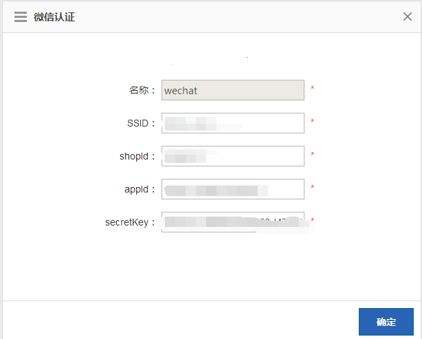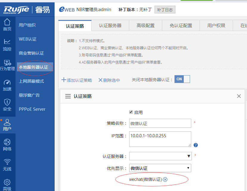 进入设备WEB页面,选择“用户”—》”本地服务器认证”, 添加微信认证服务器