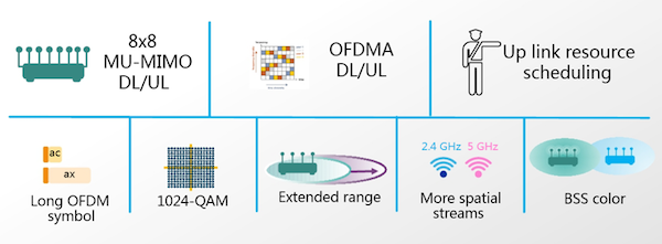 802.11ax,也称为高效无线网络(High-Efficiency Wireless - HEW),通过一系列系统特性和多种机制增加系统容量,通过更好的一致覆盖和减少空口介质拥塞来改善Wi-Fi网络的工作方式,使用户获得理想的体验;尤其在密集用户环境中,为更多的用户提供一致和可靠的数据吞吐量,其目标是将用户的平均吞吐量提高至少4倍。也就是说基于802.11ax的Wi-Fi网络意味着前所未有的高容量和高效率。