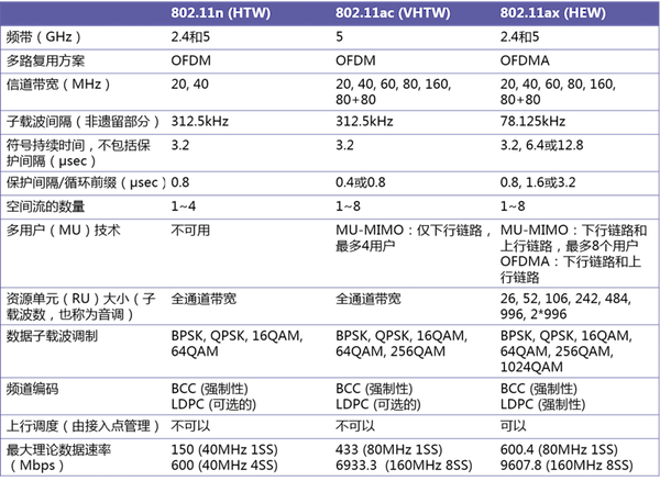 ▲802.11n、802.11ac和802.11ax的关键PHY比较
