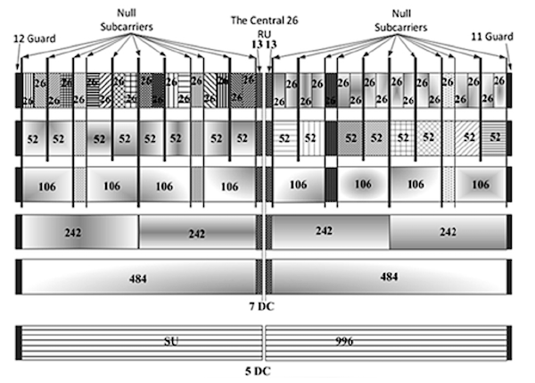下图显示了用于80MHz信道带宽的26,52,106,242,484和996个子载波RU位置。 用户只能分配给一个RU,RU大小≥106可以分配给多个用户。