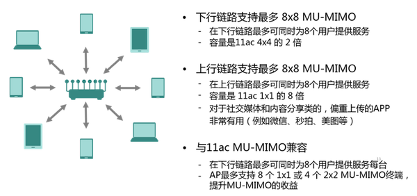 • 上行链路最多可同时为8个用户提供服务,容量是802.11ac的8倍;下行链路最多可同时为8个用户提供服务,容量是802.11ac的2倍。