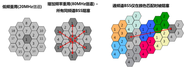 • BSS着色机制使设备能够区分自己网络中的传输与邻近网络中的传输,在尽可能的情况下最大限度去减少同频干扰。