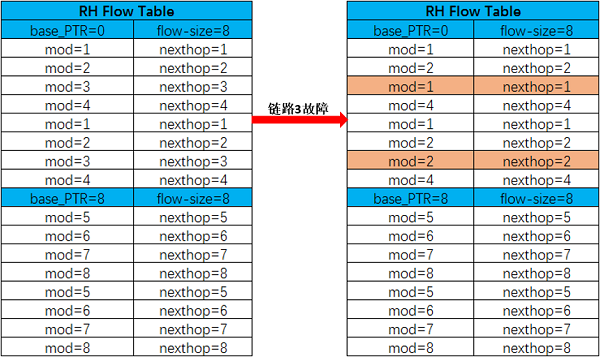在交换机上生成一张索引表(RH Flow Set Table),用于存放相关索引值对应下一跳路由地址。数据报文经过路由查表后找到对应ECMP 基值,提取HASH因子进行HASH运算,在HASH Key与ECMP数量取余数时无论是否出现故障链路,均以最初数量进行取余运算,因此运算结果一致,非故障链路数据依然按照原有链路转发。如下图中,链路3故障后软件CPU将及时更新RH flow table,将失效链路用正常链路均匀替换。