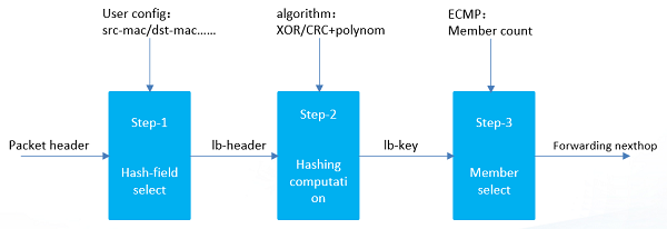 基于步骤一提取的 HASH 因子,根据 HASH 算法进行计算,得出相应的 HASH lb-key(load-balance key)。 ECMP 流量均衡支持的 HASH 算法包括异或(XOR)、CRC、 CRC+扰码等。