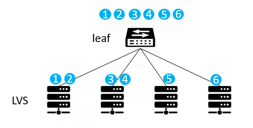 当Leaf交换机发送6条数据流到LVS服务器,Leaf先进行HASH运算负载均衡到每一台LVS服务器上,正常流量转发如图例2所示: