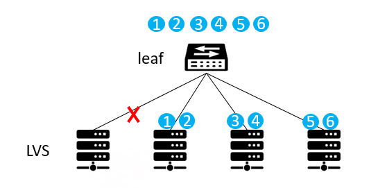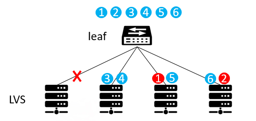 当某台LVS服务器网卡出现故障或者链路出现故障,Leaf交换机会将ECMP组内数据流将重新HASH计算,再进行负载均衡到剩余有效链路上,进而导致TCP会话断开,发生雪崩现象,例如一些支付类业务,同一个用户的一次支付过程会调用多个业务服务,业务侧要求一次支付的过程都落在同一个处理服务器上,当出现单条链路故障后不仅影响该链路所在LVS承载的用户,同时还影响该ECMP组下其他LVS承载的用户,如图例3所示: