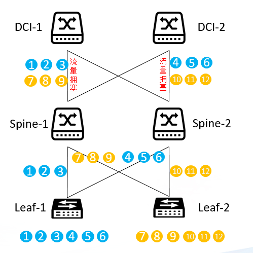 如图例7所示,在Leaf设备和Spine设备均采用上联链路数为偶数且ECMP算法及HASH因子一致的情况下,数据流在Leaf设备上经过一次HASH计算,将数据流负载分担到两台Spine上,均衡后效果为数据流1、2、3转发至Spine-1,数据流4、5、6转发至Spine-2,Spine再进行HASH计算负载分担到两台DCI核心上,因在Spine层采用的HASH算法与Leaf的HASH算法一致,最终Spine-1的数据流1、2、3均转发至DCI-1上,未负载分担到DCI-2上任何数据流,而Spine-2的数据流4、5、6均转发至DCI-2上,未负载分担到DCI-1上任何数据流,同理Leaf-2发送的数据流也是如此,进而产生HASH极化问题,导致SPINE和DCI之间链路有一条空闲,极大的浪费了网络资源,甚至会导致流量拥塞。