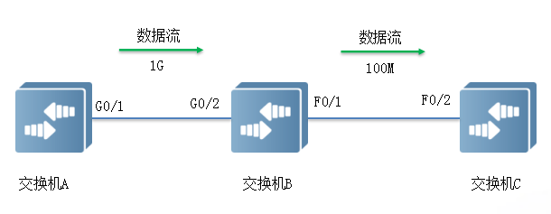 当F0/1在转发报文出现拥塞时,交换机B会在端口缓冲区中排队报文,当拥塞超过一定阈值时,端口G0/2向G0/1发PAUSE帧,通知G0/1暂时停止发送报文。
