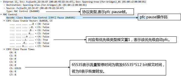 如下图中报文解析所示,PFC在基础流控IEEE 802.3X基础上进行扩展,允许在一条以太网链路上创建8个虚拟通道,并为每条虚拟通道指定相应优先级,允许单独暂停和重启其中任意一条虚拟通道,同时允许其它虚拟通道的流量无中断通过。