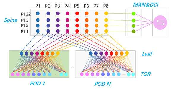 ▲ 图1:大型数据中心Spine-Leaf组网架构(内网)