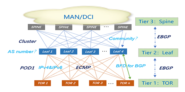 TOR至Leaf至Spine至MAN/DCI,逐级通告业务网段+管理网段+Loopback,在去堆叠场景时TOR需要向Spine通告主机路由。