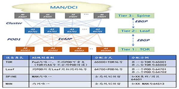 如图4所示,多组TOR+Leaf组成一个POD(最小交付单元,Point of delivery,作为数据中心基本物理设计单元)。Spine负责横向连接多个POD,而MAN/DCI负责提供跨区域的互联。IDC的BGP路由规划建议如下: