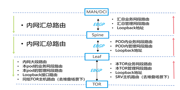 MAN/DCI至Spine至Leaf,传递整个内网的汇总路由,比如10.0.0.0/8;172.16.0.0/12;192.168.0.0/16。而Leaf至TOR,除了通告内网汇总路由外,还需要通告本Pod的业务网段+管理网段+Loopback(当Leaf上行链路故障时,同POD的流量仍可以匹配明细路由,通过Spine转发)。