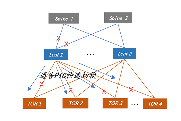 BGP路由收敛需要在路由表中删除失效路由,并增加新的路由,同时在芯片转发表中实现对应的增、删。在存在大量路由的情况下,逐条删除并刷新路由表需要一定的时间,收敛时间可能达到数秒甚至数十秒。尊龙时凯RGOS软件在路由收敛上提供了优化的手段:支持前缀无关收敛。如图6所示,Leaf 1设备到Spine设备所有EBGP邻居都失效时,Leaf 1会向所有TOR通告去往Spine的 AS不可达。TOR接收到此消息,查找预先分配好的对应的ID索引(依据Spine的AS号及Leaf的Router-ID分配),通告转发表进行下一跳切换,从而实现业务的快速收敛,其收敛速度不再受限于路由条目数。(某大型互联网公司实测12K路由,收敛时间0.7秒)