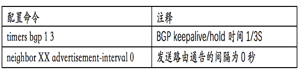 BGP需要使用keepalive消息来实现会话的保活,确定下一跳的可达性。如前文所述,BGP最早是设计应用于不同自治系统(服务商)之间互联的。不同AS之间路由的稳定性比快速收敛更为重要,为了防止路由震荡,BGP协议默认的计时器非常长,其keepalive/hold timer分别是60S和180S。而在数据中心内部,故障的快速收敛更为重要,推荐采用1S/3S的BGP计时器配置加快收敛。BGP还有另外一个重要的计时器:Advertisement Interval,即发布路由通告的间隔。在这个周期内的BGP事件会被缓存起来,等待计时器到了后再统一发送。BGP默认的通告间隔是30S。在数据中心需要立刻通告变化,因此推荐的配置是0 S。