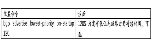 BGP延迟发布:在设备重启时,可能会存在路由表还未下发到本地的硬件表项,却将路由信息通告给邻居,从而提前引流导致流量转发异常的情况。为避免此问题,可以设置BGP在整机重启时把发布的路由调整为最低优先级