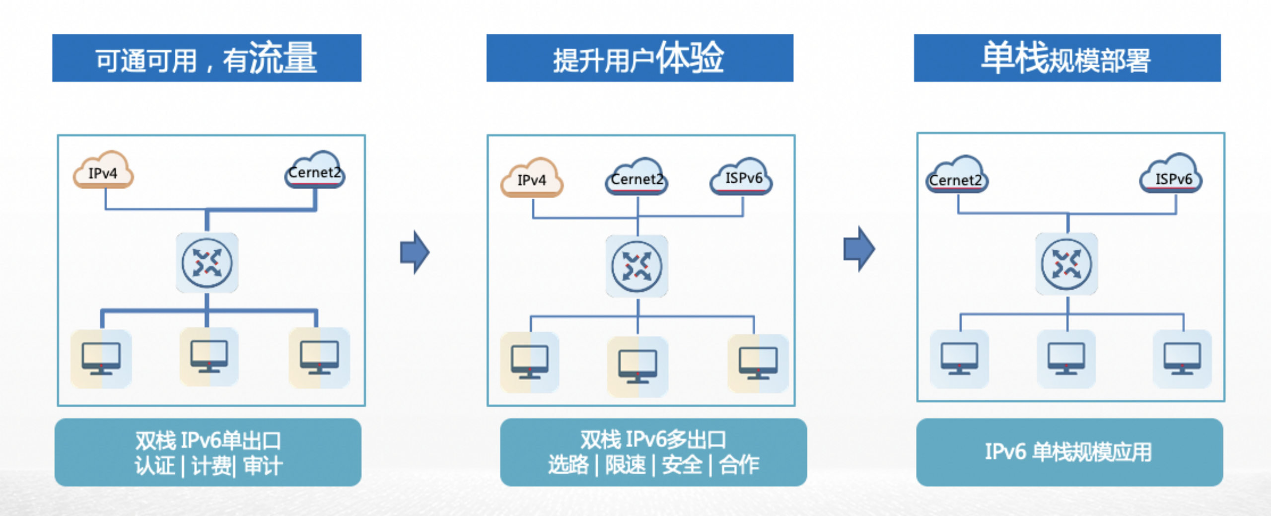 二、在可通可用的基础上,提升用户的体验。主要建设IPv6多运营商出口,重点关注选路、限速、安全以及运营合作;