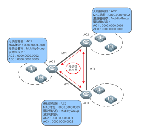 在漫游组内,每个AC都保存有一个漫游组内其他成员的列表(如下图所示)。当一个STA加入某个 AC的时候,该AC会向漫游组内的其他AC发送通告信息;如STA是首次接入漫游组,那么其最初接入的AC(漫出AC/HA)就会保存其相关信息;当STA漫游到其他AC的时候,该AC就会将STA的信 息同步给相关AC(漫入AC/FA);如果该STA是漫游用户,那么STA原来所在的AC(漫出 AC/HA)在收到通告信息后就会将STA的相关信息同步给当前的AC(漫入AC/FA)。