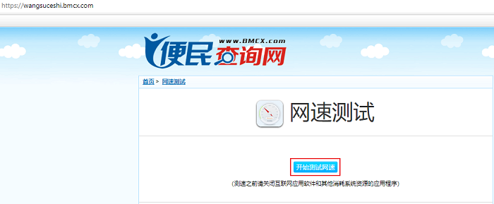 打开任意浏览器,在地址栏中输入网址“http://wangsuceshi.bmcx.com/”,弹出网速测试首页如下图所示: